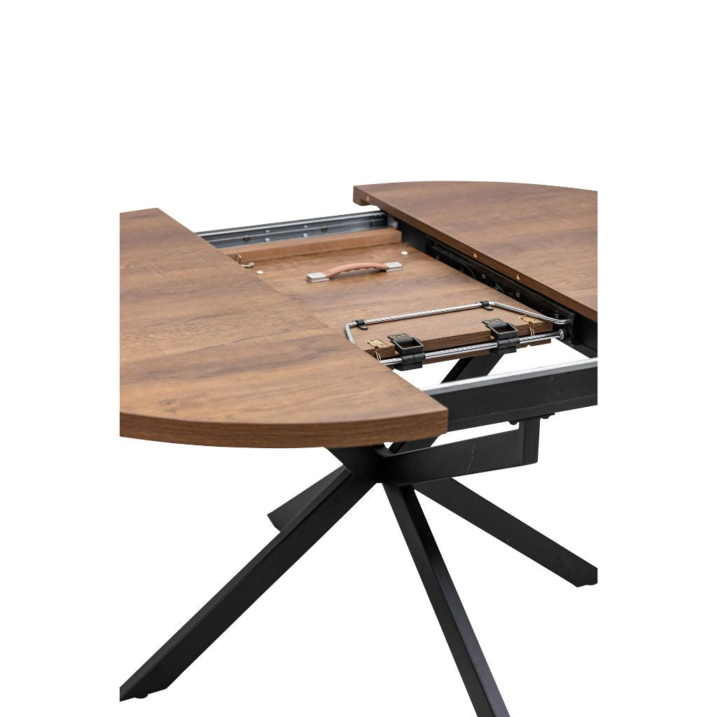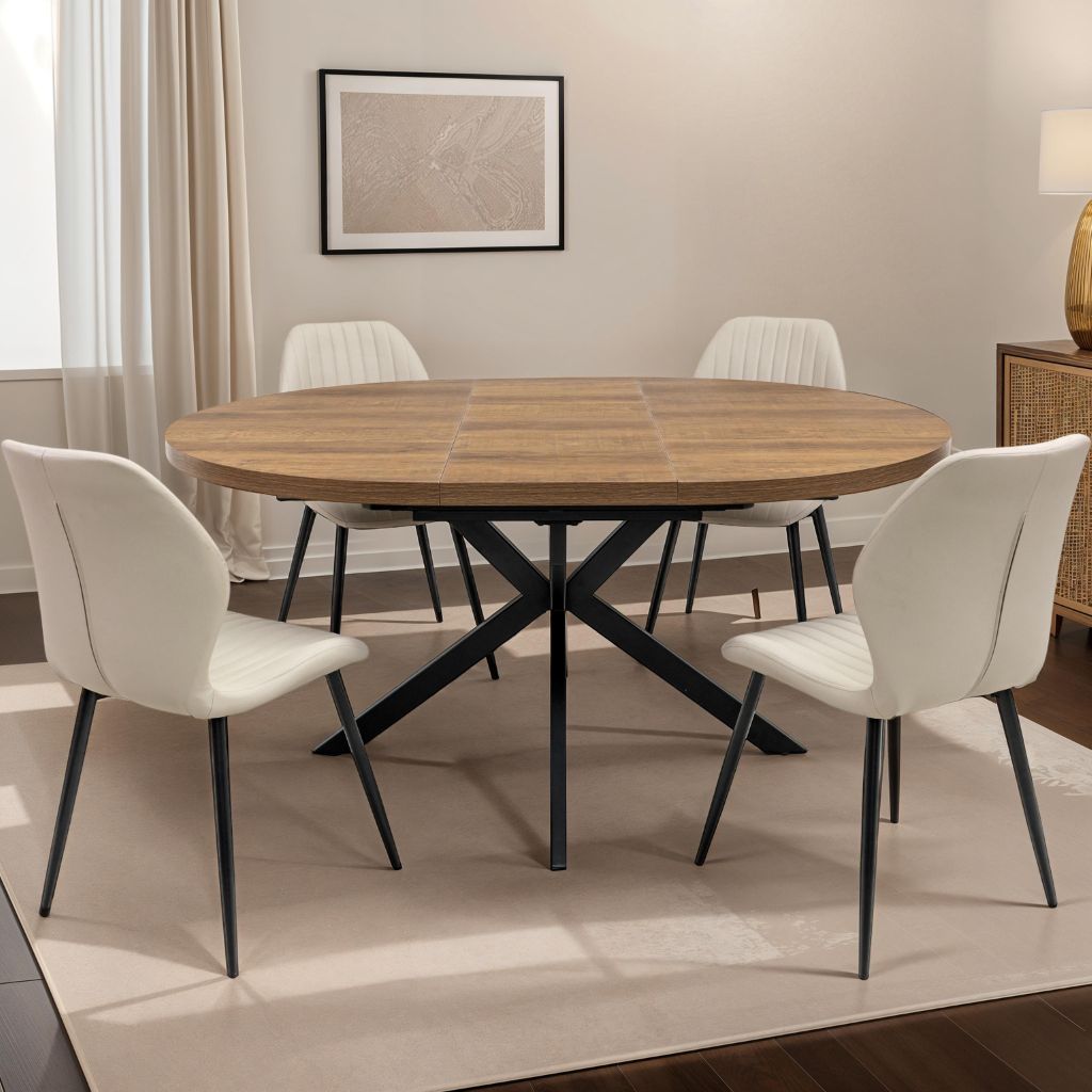 The Panni 1.2m Round Oak Extending Dining Table is a stunning dark oak dining table with black powder coated legs. Paired with the stunning Dalmine Stone Faux Leather Dining Chairs.
